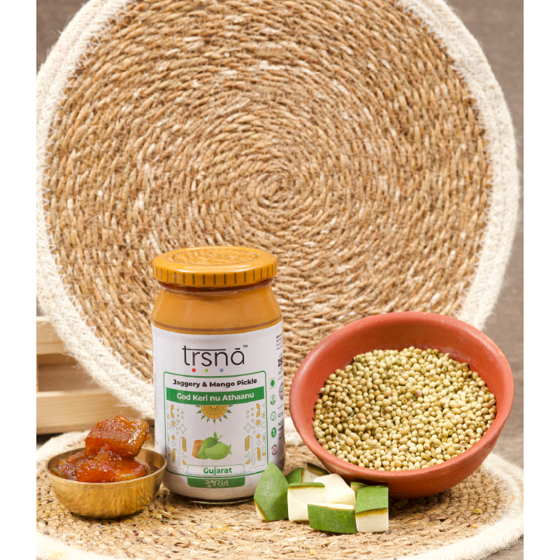 “A golden Gujarati heirloom where tart mango meets molten jaggery in a sunlit symphony.” Description Trsna’s God Keri nu Athaanu is a golden celebration of Gujarat’s sun-drenched summers. Our God Keri nu Athaanu is handcrafted at the peak of mango season in small, artisanal batches at its Gujarat origin. We use only locally harvested, peak-fresh…