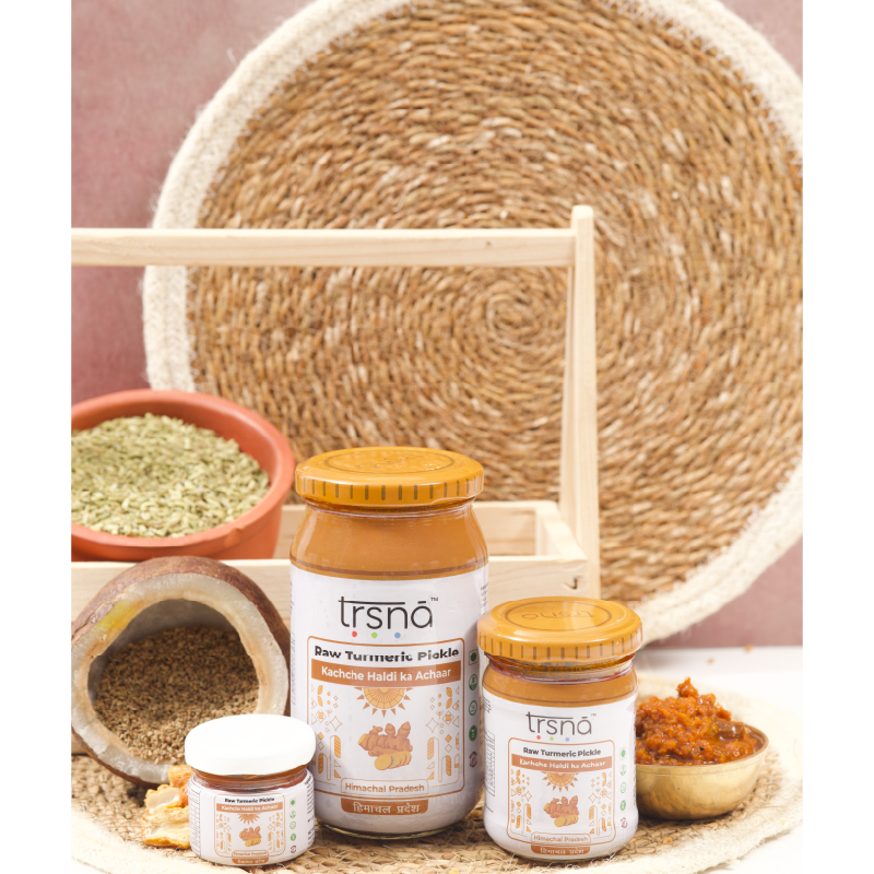 “A golden Himachali elixir where earthy roots meet festive indulgence.” Description Trsna’s Kachche Haldi ka Achaar is a golden tribute to Himachal’s healing traditions Our Kachche Haldi ka Achaar is handcrafted during peak turmeric harvest in small, artisanal batches at its Himachali source. We use only locally foraged, mountain-fresh ingredients and a centuries-old heirloom recipe…