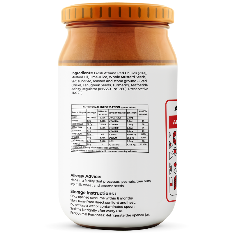 Yes—wonderfully bold. Athana red chillies offer intense warmth, amplified by mustard seeds and red chilli powder. Lime juice adds tang while fenugreek and turmeric offer a grounding bitterness, making the heat vibrant but balanced.