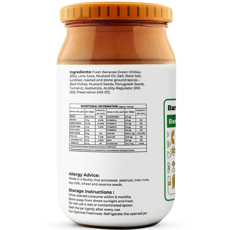 - Banarasi green chillies are known for their mild heat and vibrant aroma, making them ideal for pickling.