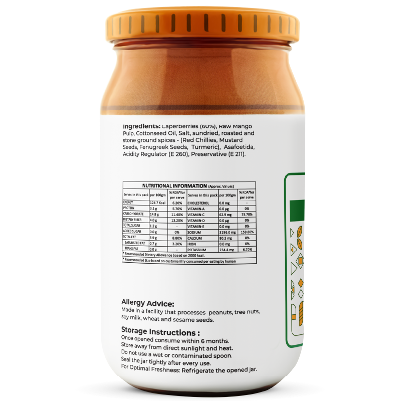 Each jar is handcrafted at source in Gujarat, especially in the regions where caperberries naturally thrive. Prepared by local artisans, it captures both the terroir and the legacy of Gujarati pickling artistry.