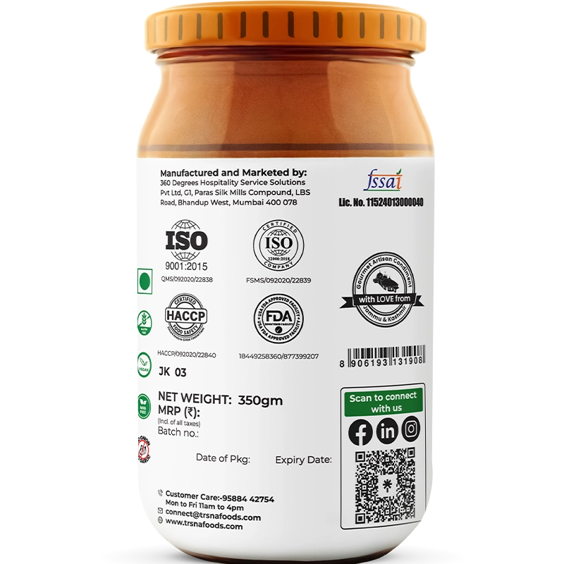 Trsna’s Haak Saag ka Achaar is made with 70% fresh collard greens—locally known as “haak,” a staple of Kashmiri cuisine—and stewed in pungent mustard oil with tomatoes and sea salt. It’s spiced with a layered blend of roasted whole mustard and fenugreek seeds, and a sun-dried, stone-ground mix of red chillies, cumin, coriander, nigella, carom seeds, turmeric, and asafoetida. Produced in-season and at source using heirloom recipes, every batch captures the bold green bitterness and savoury warmth of mountain home kitchens—no shortcuts, no substitutions.