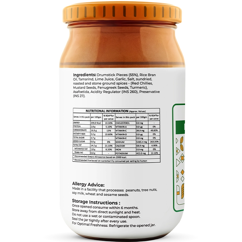 Each jar is handcrafted in coastal Andhra Pradesh by skilled local artisans, using regionally sourced drumsticks and spices to preserve authentic flavours.