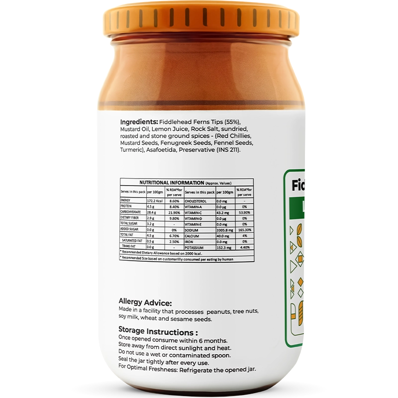 This pickle is handcrafted at source in Himachal Pradesh, where fiddlehead ferns grow naturally along forested slopes. It’s prepared by local artisans using traditional techniques and regionally sourced spices.