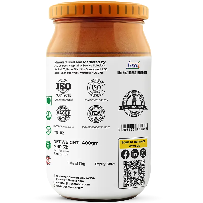 Our Elumiccai Kuzhambu is handcrafted at the peak of lemon season in small, artisanal batches at its Tamil Nadu source. We use only locally harvested, sun-fresh citrus and heirloom spices passed down through generations. At Trsna, we refuse gimmicks or substitutions—including our original gingelly oil—so every jar delivers uncompromised authenticity and true South Indian flavour. Each jar is slow-roasted, stone-ground, and steeped in authenticity. No shortcuts. No compromises. Just pure, citrusy brilliance in every spoonful.