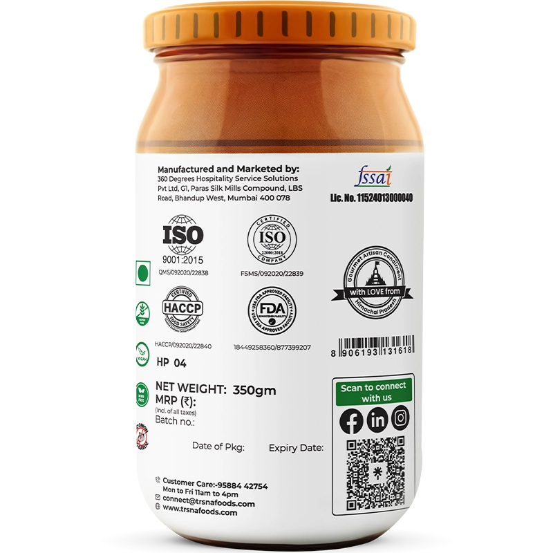 Trsna’s version features 45% hand-sliced lotus stem, harvested fresh in-season from Himachal’s wetlands. These crunchy slices are marinated in mustard oil and lime juice, then seasoned with a traditional heirloom blend—red chillies, fennel, nigella, fenugreek, carom seeds, and turmeric—sun-dried, roasted, and stone-ground. Made in small batches at source with zero substitutions, especially in the oil, this pickle embodies the clean crunch and bold spice of Himalayan craftsmanship.