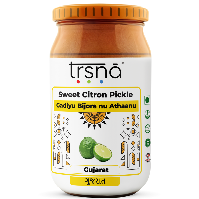 Our Gadiyu Bijora nu Athaanu is made at peak citron season in small, artisanal batches at its Gujarat origin. We use only locally harvested, peak-fresh citrons and a traditional heirloom recipe handed down through generations. Trsna rejects gimmicks and substitutions—including our original cottonseed oil—so every jar captures uncompromised authenticity and the true essence of Gujarati pickle craftsmanship. Each jar is sun-cured, stone-ground, and steeped in authenticity. No shortcuts. No compromises. Just pure, sweet-citrus brilliance in every spoonful.