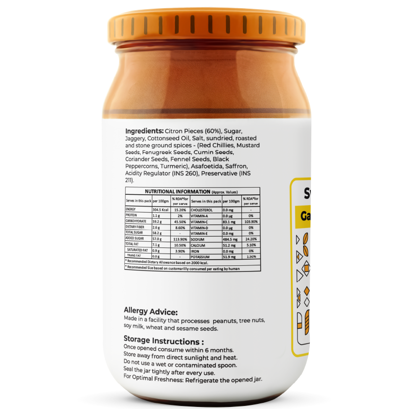 It’s handcrafted at source in Gujarat by skilled artisans using regionally grown citron and spices. Each jar honours age-old techniques and culinary wisdom passed down through generations.