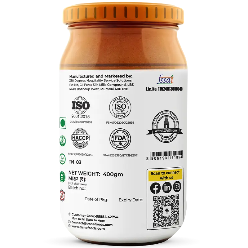 Trsna’s version showcases 30% rich tamarind extract blended with gingelly oil, jaggery, and a medley of tempered spices—red chillies, mustard seeds, sesame, fenugreek, coriander, and turmeric—roasted and stone-ground at source. Brown chickpeas and peanuts add texture and warmth, while each batch is handcrafted using heirloom temple-style recipes passed down through generations. No shortcuts, substitutions, or compromise—especially not in oil. It’s a tangy-spicy concentrate that captures the soul of Tamil Nadu’s sacred prasadams and home-cooked rice traditions.