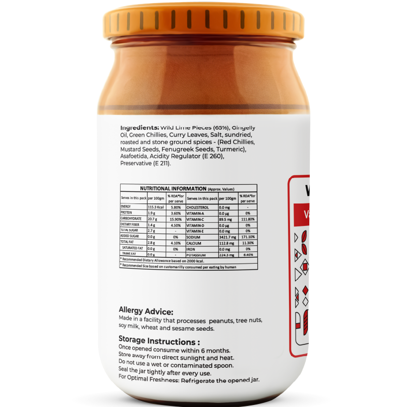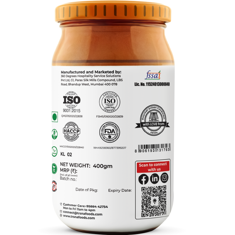 Trsna’s pickle features 65% fresh wild lime pieces (Vadukapuli)—a native citrus fruit of Kerala known for its large size, intense aroma, and bold acidity. Marinated in gingelly oil along with green chillies, garlic, and curry leaves, it’s layered with a traditional blend of sun-dried, roasted, and stone-ground spices like mustard seeds, fenugreek, turmeric, and red chillies. Crafted in small batches at source and built on heirloom recipes, Trsna’s version reflects regional purity, with no ingredient substitutions—even the oil remains true to tradition.